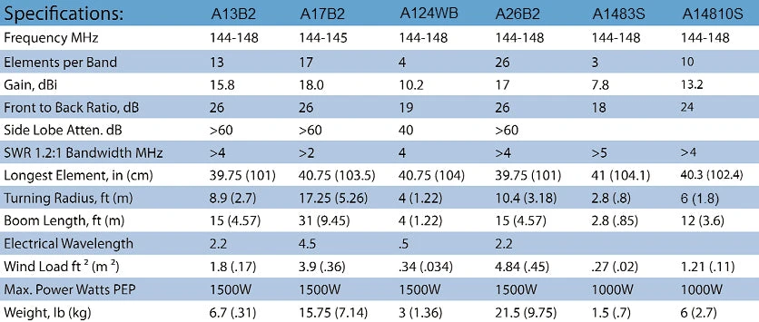 The serious two meter operator who is interested in EME, aurora, scatter, SSB, CW, tropo etc, will choose the A17B2. It has 17 elements on a 4.5 wavelength boom.