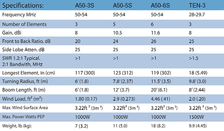 Computer-aided modeling and test range techniques were used by Cushcraft engineers to further optimize the performance of our popular 6 meter Yagis. This process means more gain and cleaner patterns with excellent front-to-back ratios. S-models have very broad bandwidth so they will not detune in bad weather. They feature stainless steel hardware for long trouble-free life. Enjoy the new popularity and exciting contacts on the 6 meter band with one of the S-series Laird Yagis.
