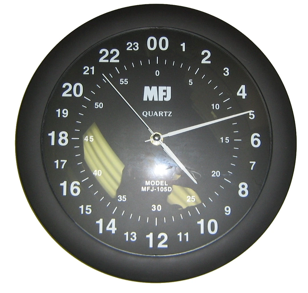MFJ-105D has a handsome black face with white numerals and gold hands. White diameter trim looks impressive in any room.
