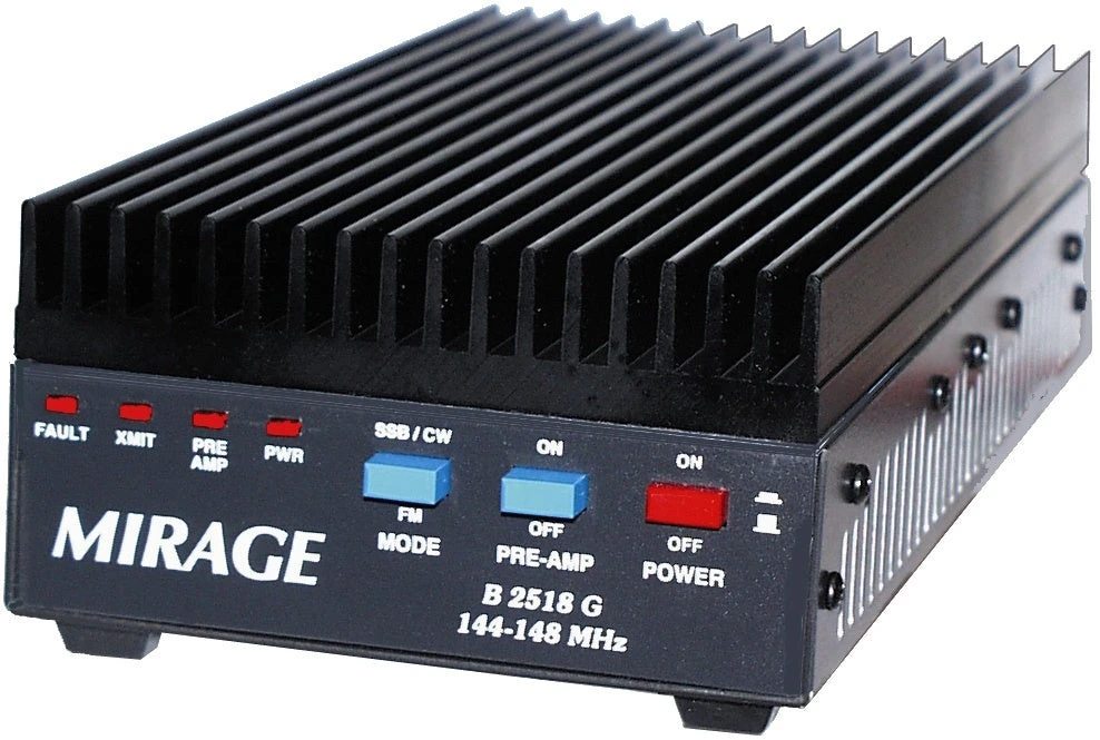 MIRAGEÂ’s most popular amplifier gives you 160 Watts of output power for just 25 W in from your base/mobile rig! The B-2518-G is ideal for your 20 to 60 Watt 2 Meter mobile or base station. You will talk further, longer, clearer on all modes – FM, SSB, CW- hear weak signals better than youÂ’ve ever heard before! You get a low noise 20 dB GaAsFET preamp with an excellent 1 dB noise figure for pulling out weak signals. B-2518-G is fully protected with features found in expensive commercial amplifiers. High SWR or excessive input power can damage your amplifier. Protection circuits automatically bypass your amplifier to prevent damage and an LED lights to warn you. An Active-Bias™ system keeps SSB voice crisp and clear for fantastic operation. Other amplifiers using conventional bias methods tend to produce splatter and distortion as power level changes. This amp with Active-Bias™ doesnÂ’t exhibit the problem. Adjustable time delay gives you smooth transmit/receive switching. Remote external keying. Extra heavy duty custom heatsink spans the entire cabinet. Draws 17 – 22 A from 13.8 VDC. Compact 12″ x 3″ x 5.5″.
